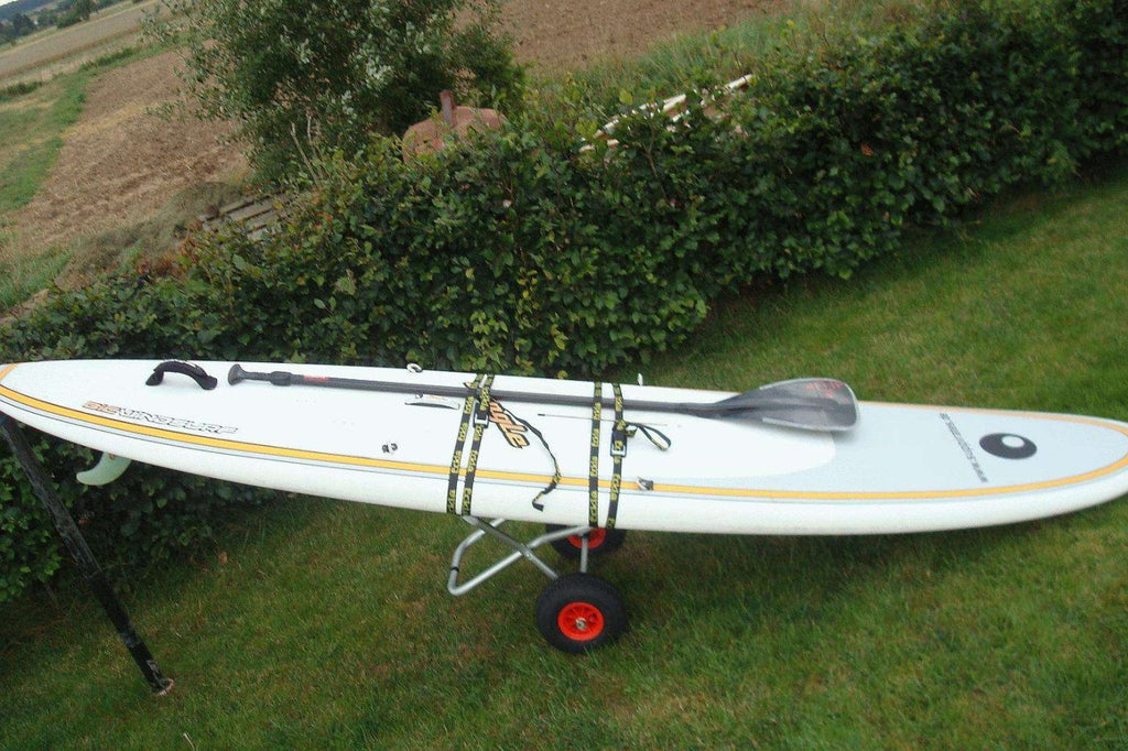 Zuverlässiger Transportwagen in hervorragendem Design für Ihr Surfboard oder SUP samt Zubehör. Silbern eloxiertes, dickwandiges Aluminiumrohr. Dadurch trotz geringem Gewicht sehr stabil und rostfrei. Luftbereifung für ruhigen Lauf und schonenden Transport Ihres Surfboards.